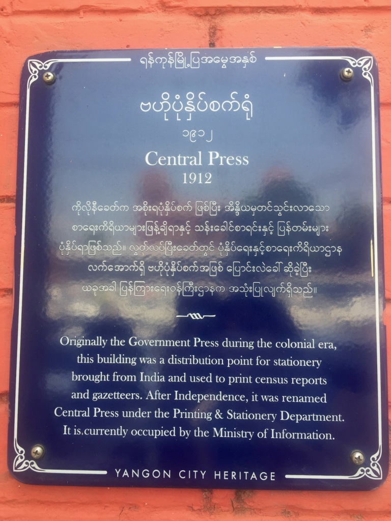 A grand street with lots of important buildings, many with Blue Plaques, thanks to Yangon Heritage Trust: http://www.yangonheritagetrust.org.