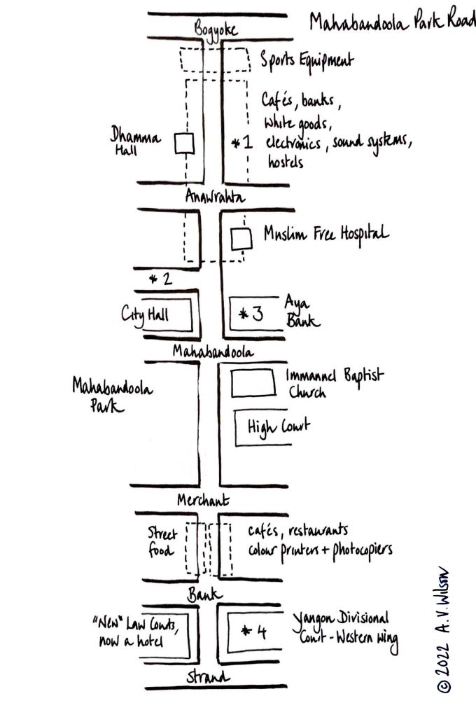 *4 The Yangon Divisional Court had three wings – stretching across to Pansodan Road. Here you can see the sadly dilapidated Western wing, in stark contrast to the splendid conversion of the 1927 Law Courts into a (not yet opened) luxury hotel (recently awarded a Blue Plaque too, see *3), directly opposite.