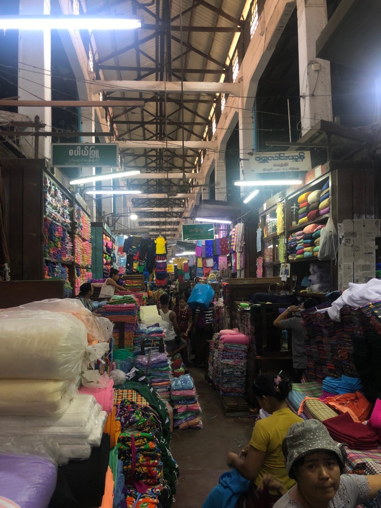 Another short street – two blocks between the back of Junction City and a small patch of green on Merchant Road. The upper block is “sewing street”, selling everything you need for sewing, from machines to threads, beads, sequins and zippers. And behind the sewing stalls on either side are Blocks B and C of Thein Gyi Zay, downtown Yangon’s largest covered market.
