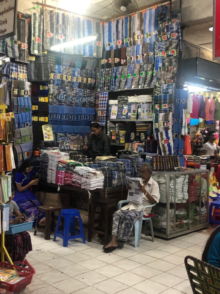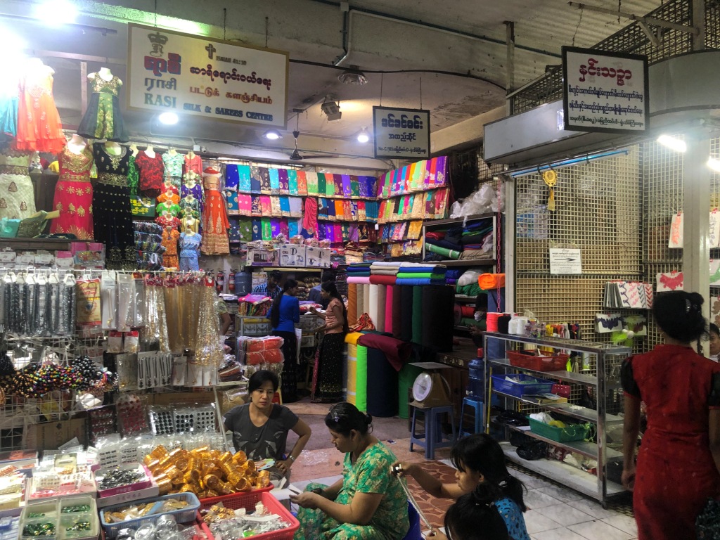 On the upper block you can find one of Yangon’s largest and newest shopping malls, Junction City, the Pan Pacific Hotel and the grounds of Yangon General Hospital. The middle block is flanked by the two largest sections of the big market, Thein Gyi Zay – the extraordinarily busy and cramped stalls of Thein Gyi Zay block D, and the empty floors and wide staircases of Thein Gyi Zay block C. Block D sells fabrics, bags, shoes, everything really – in both wholesale and retail quantities. The buildings are from the 1960s and 1970s and fairly characterless. The lower block has older buildings – Thein Gyi Zay Block E sells paints, painting supplies and hardware, and further down the shops sell large power tools, pumps, ladders and plumbing supplies.