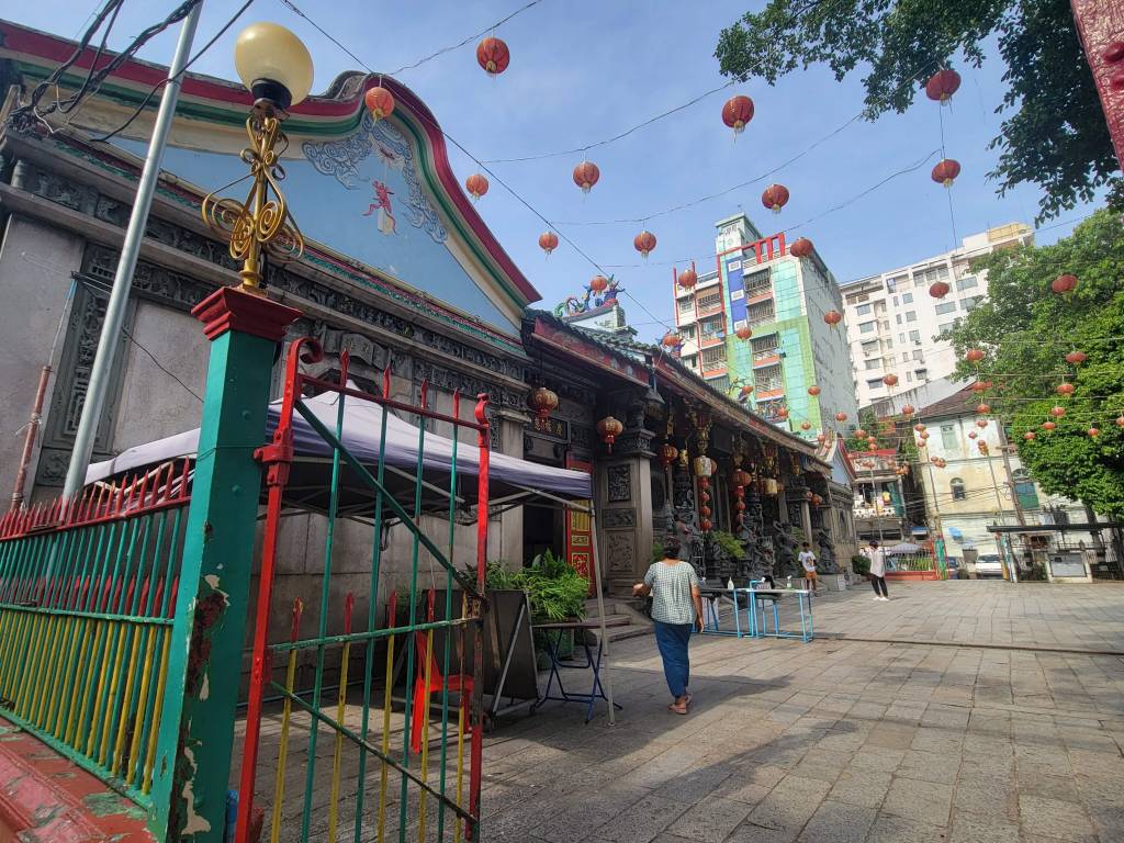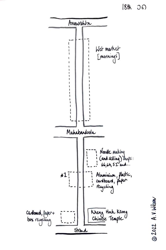 An archetypal Chinatown street – from the old Chinese Temple at the corner with Strand; to the amazing wet market that runs between Anawrahta and Mahabandoola (mornings only) where you can buy all sorts of meat, fish, vegetables; and with hand-made noodle shops and lots of recycling places in between.