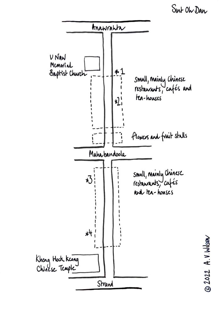 It is also the place to go if you are feeling hungry for family-style Chinese food – the street has many small cafes, restaurants and tea-shops. Myanmore wrote about the cafes and recommended these places in May 2022: https://www.myanmore.com/2022/05/hunting-street-food-in-yangon-sint-oh-dan-street/?amp=1
