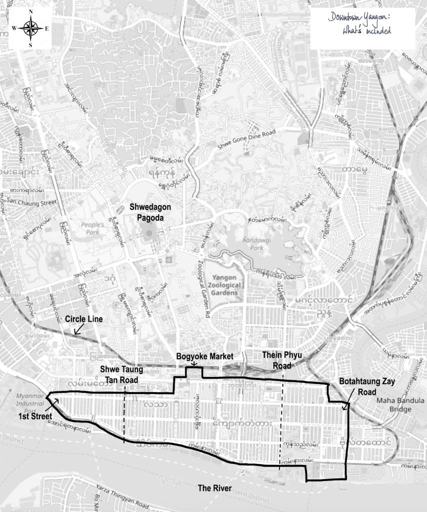 For the purposes of the Yangon Street Map, downtown Yangon is defined as everything between the circle line railway to the North and the river to the South, and from 1st street in the West to Botahtaung Zay Road in the East, as shown in the map.